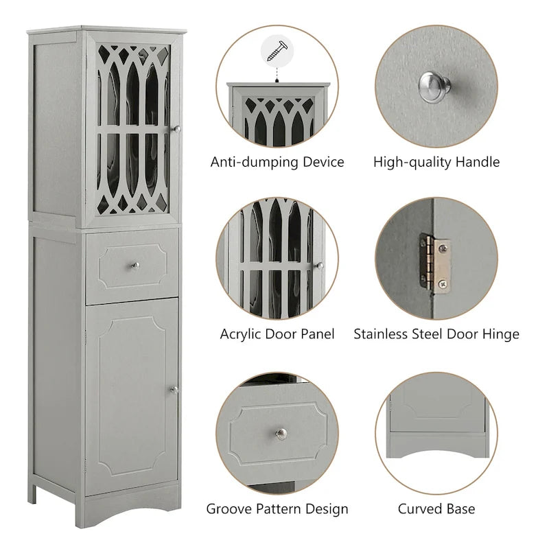 [Modern Design]: Featured with a sleek and classic look in light color, the top and bottom panel has a beautiful curve design, and the groove pattern on the drawer and door adds more elegant elements to satisfies the combination with your bathroom decoration style. [Ample Storage]: This bathroom cabinet has an above enclosed cabinet with an acrylic panel door, and one drawer and an another cabinet with door below, which can totally satisfy your daily storage needs. Your can put your towels, shampoos, and other bathroom essentials in it.