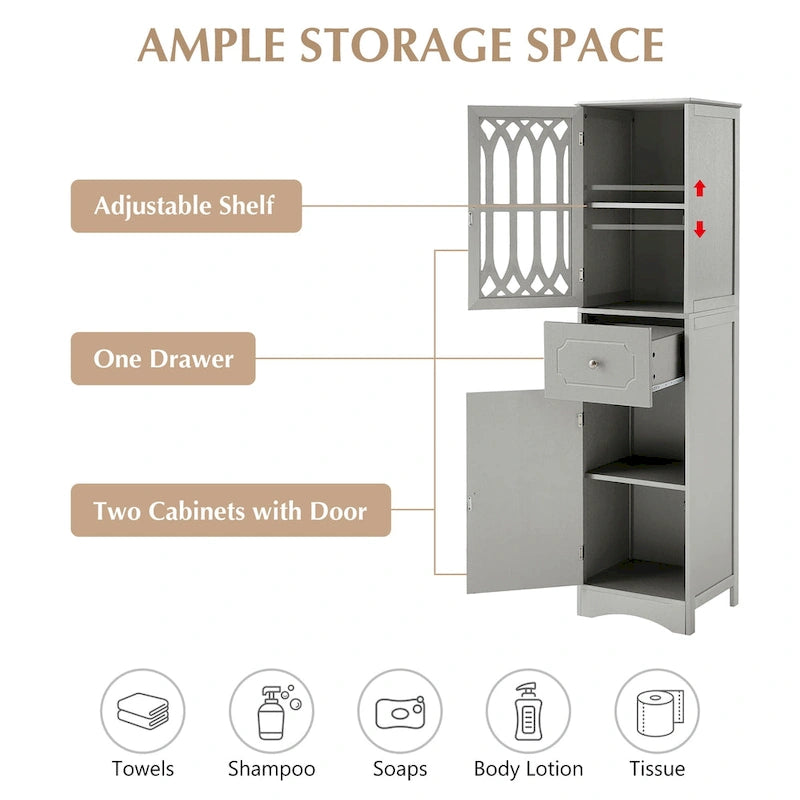 [Space Saver]: With a slim and compact body, this cabinet will not occupy much room. Just put it in a corner and then you can get a space-saving bathroom furniture. This cabinet also equips with an anti-tip kit so can to protect it from tipping.