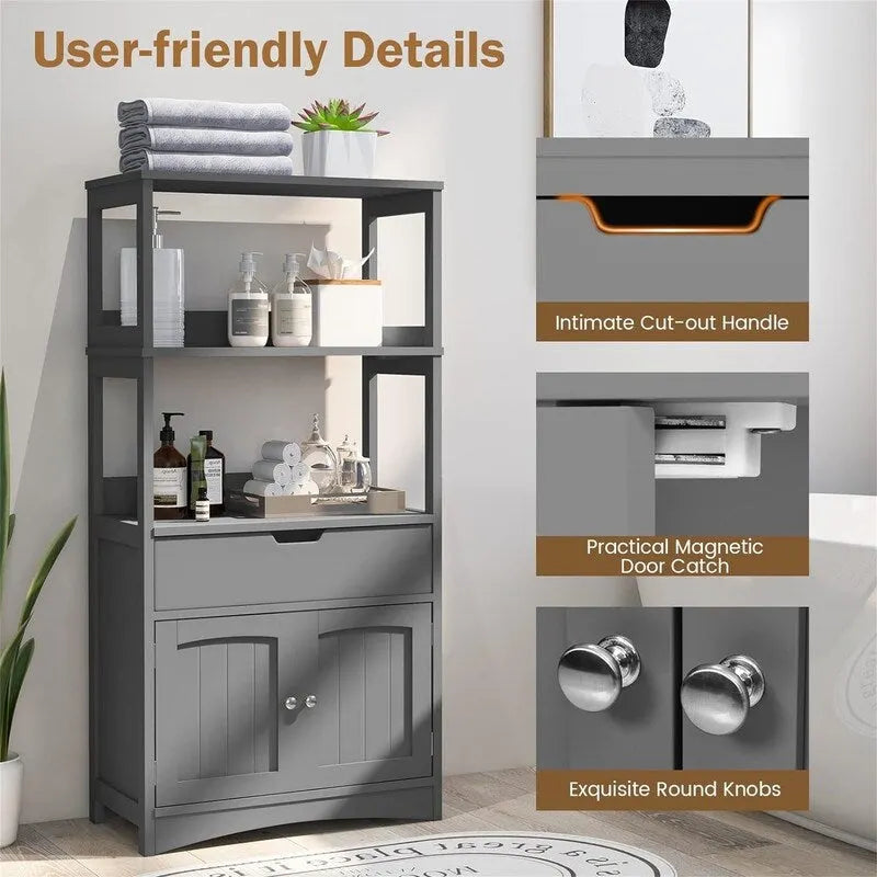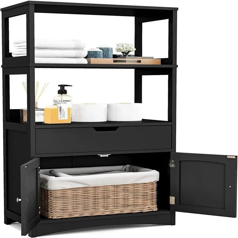 - Considering its classical design and black furnish, this freestanding storage cabinet could be used in many rooms. It is a great bathroom floor cabinet for storing towels, roll papers, shampoos and other bath essentials. It is also a great cupboard that used in the kitchen for placing your microwave, dishware, cookware, etc. Why not put it in the living room as a side cabinet for storing your books and collections?