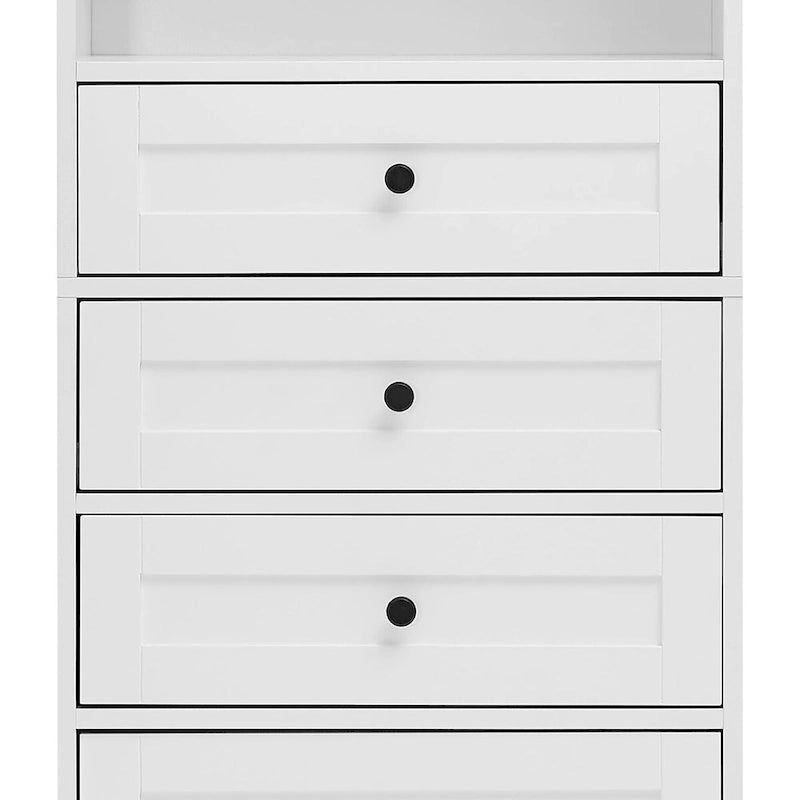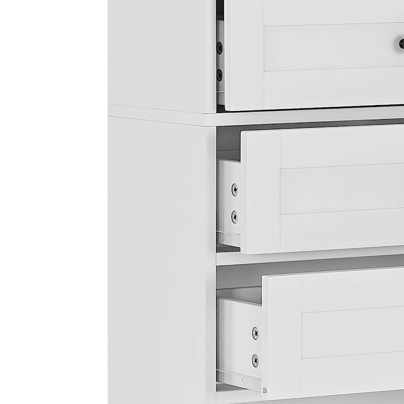 - With an open shelf, three drawers, and a large cabinet, this cabinet offers diverse storage options, allowing for organized and accessible storage of towels, toiletries, and other bathroom essentials.