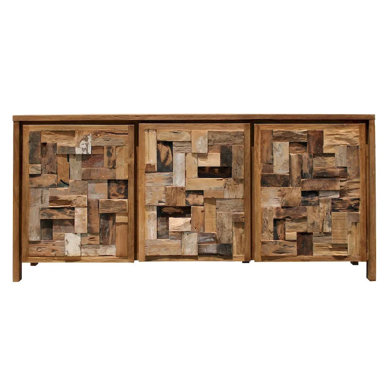 The unique recycled teak wood Apaza linen cabinet is a stand-out amongst our popular recycled teak collection. Incorporating pieces of genuine recycled teak wood in unique patterns, these cabinets are bothbeautiful and 100% eco-friendly.Handcrafted from solid and repurposed 100% Grade A teak wood by the village crafts people on the Island of Java, thisApaza cabinethas multi-colored tones with an unfinished, natural look. Two cabinets open to reveal shelving with generous storage to accommodate your favoritelinens, toiletries, towels and supplies.