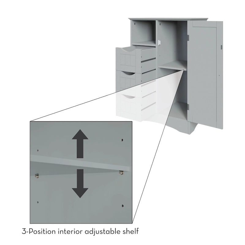 The Ashland 1-Door, 3-Drawer Floor Cabinet is a versatile storage solution for small spaces. Designed with a compact footprint, it seamlessly blends into any room, be it a bathroom, bedroom, entryway, or hallway. Its beadboard styling and mirrored door knob add a touch of elegance, while the durable painted MDF construction ensures long-lasting durability. Effortlessly declutter your living space with our bathroom cabinet organizer. The three easy-open drawers provide ample storage for towels, toiletries, and other essentials, while the adjustable shelf and open cubby offer additional flexibility. Say goodbye to cluttered countertops and embrace a neat, streamlined environment. Anchoring the Ashland 1-Door, 3-Drawer Floor Cabinet to the wall ensures unwavering stability, even in high-traffic areas. Assembly is a breeze with the included detailed instructions, allowing you to enjoy your new storage solution in no time. Whether you're seeking bathroom floor storage, a small kitchen cabinet, or a versatile bedroom cabinet, this white cabinet with a door is the ideal choice.