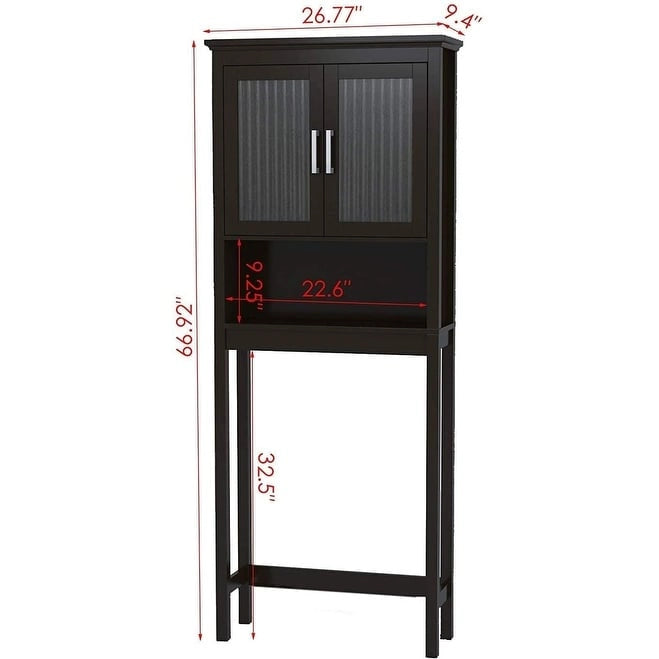 Add style and functionality to your bathroom with Spirich Home Bathroom Shelf Over The Toilet. The white cabinet is crafted with premium quality manufactured wood, pine wood, Moru tempered glass, and high-quality hinges, making it durable and stylish. This bathroom cabinet organizer offers ample storage to store and display items, with both an open shelf and hidden storage capacity. One shelf inside the cabinet is adjustable, making it great for storing toilet paper, perfumes, candles, towels, and more. Designed to save space, it conveniently fits behind most toilet setups and complements many interior styles. With detailed instructions, this assembly-required cabinet is eligible for free replacement parts.