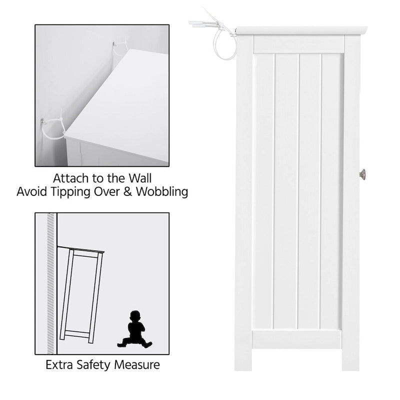 This Yaheetech Floor Cabinet offers a stylish and practical storage solution for your home. Its minimalist design, with plain decorative lines and recessed veneer center door faces, matches most home dcors. With open storage on top and adjustable shelving behind two side hung doors, this cabinet provides ample space for organizing a variety of items. Its compact size of 23.6x12x31.7 (LxWxH) makes it perfect for any room in the house. The cabinet is made of premium P2 MDF boards and comes with anti-toppling fittings for safe use. Assembly is easy with the included illustrated instructions and step-by-step video instructions.
